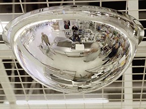 Die Überwachung wird durch einen halbkugelförmigen Spiegel mit einem Durchmesser von 450 mm oder alternativ 600 mm erreicht, der über dem Kassenbereich angebracht ist.